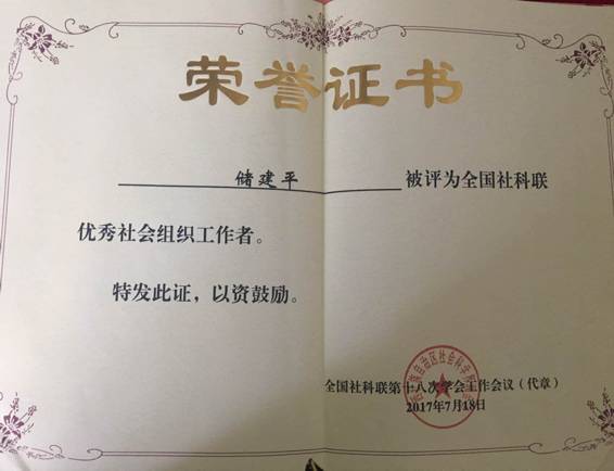 董事長儲建平獲得“全國社科聯(lián)優(yōu)秀社會組織工作者”稱號