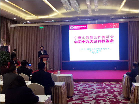 2017年11月11日上午,寧夏東西部合作促進會特邀國家行政學(xué)院前副院長周文彰教授在銀川上陵波斯頓酒店報告廳作關(guān)于學(xué)習(xí)十九大精神專題報告,報告會主題是“不忘初心,牢記使命”。大會由寧夏南林建設(shè)集團董事長、寧夏東西部合作促進會會長、黨總支書記儲建平教授主持,促進會執(zhí)行會長、秘書長、常務(wù)副會長、會員以及各黨支部黨員參會學(xué)習(xí)。
