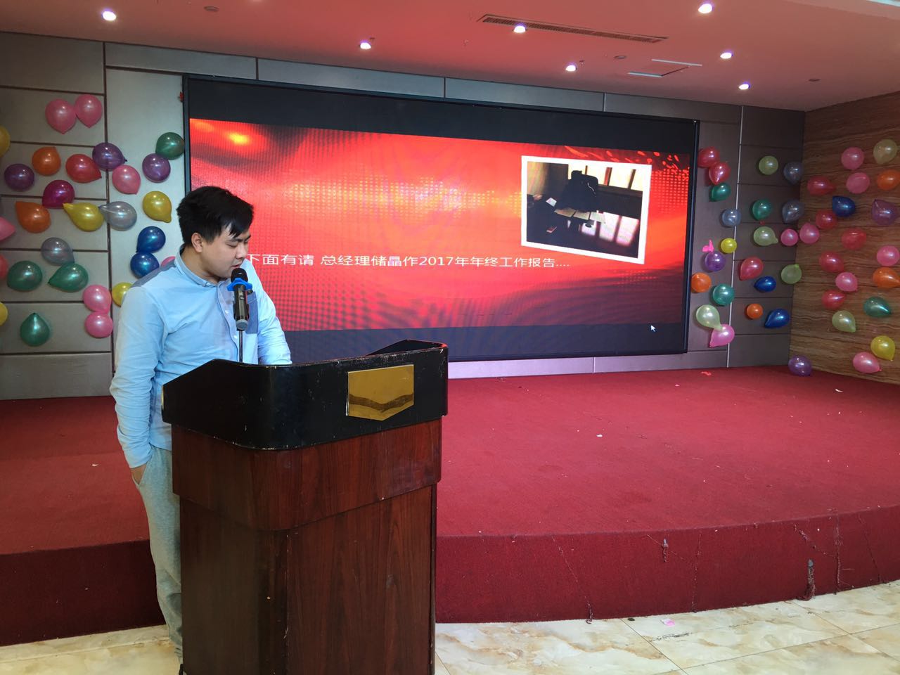 晚會(huì)開(kāi)始,通過(guò)PPT的形式為大家進(jìn)行了大事記回顧,回顧了我集團(tuán)董事長(zhǎng)儲(chǔ)建平,總經(jīng)理儲(chǔ)晶以及公司2017年取得的榮譽(yù)和成績(jī)。然后由公司總經(jīng)理儲(chǔ)晶作2017年工作總結(jié)報(bào)告。儲(chǔ)總經(jīng)理首先總結(jié)了過(guò)去一年公司所取得的成績(jī),對(duì)全體員工為公司發(fā)展所做出的努力表示肯定與感謝,接著對(duì)公司2018年的發(fā)展確定目標(biāo)、提出新要求,并向全體員工送上節(jié)日的問(wèn)候和祝福。